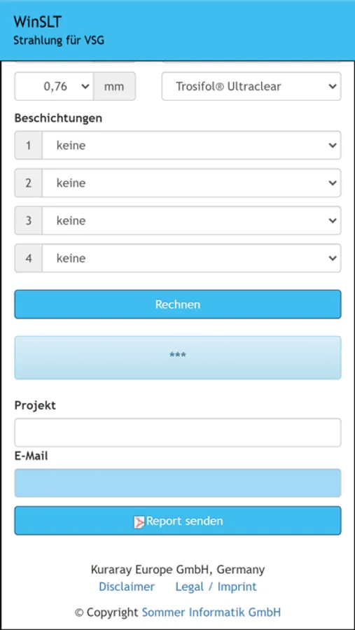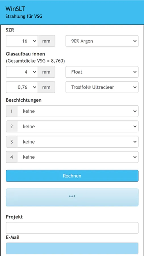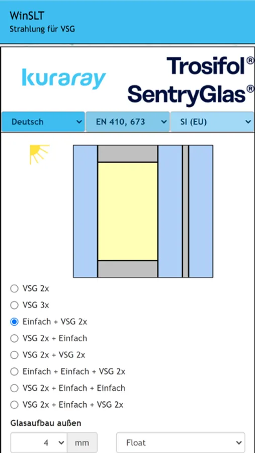 von Verglasungen (Einfach oder VSG) in Kombination mit Sonnenschutz und PVB-Folien. Es kann in kurzer Zeit ein beliebiger Aufbau erstellt und nach den Normen:
