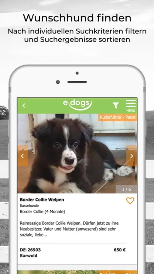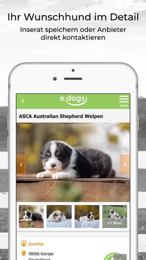 edogs ermöglicht eine zügige Vermittlung an neue, potenzielle Halter Ihrer Hunde. Sie können alle wichtigen Merkmale in den Verkaufsanzeigen angeben, ansprechende Bilder sowie Videos hochladen und einen detaillierten Beschreibungstext verfassen. So können potenzielle Besitzer einen optimalen Eindruck von Ihrem Hund bekommen!