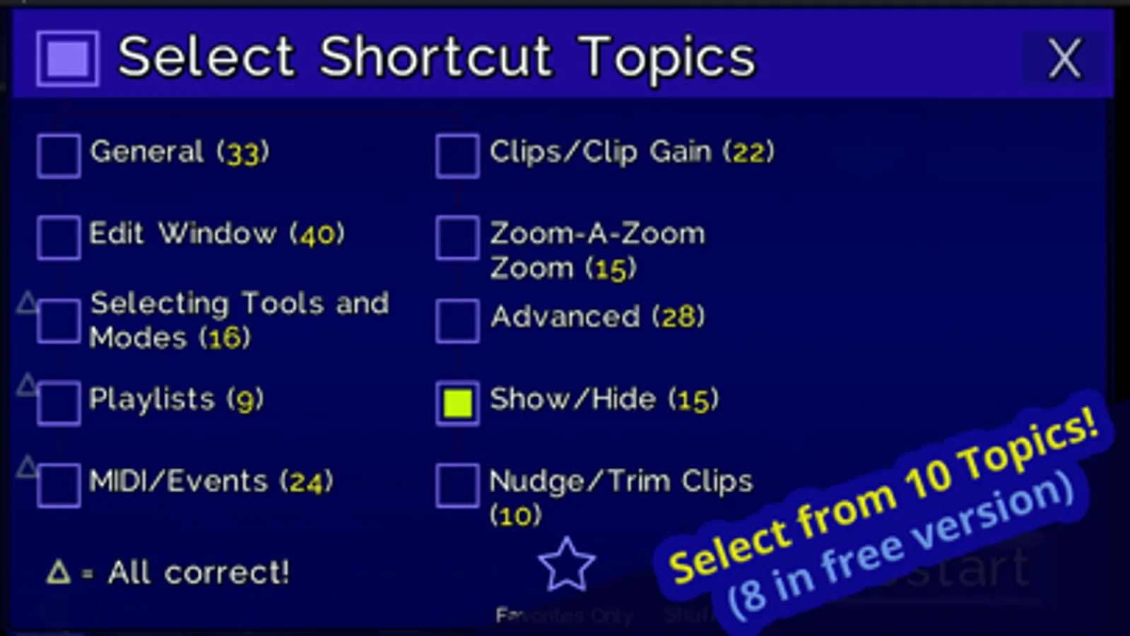 - 228 Shortcuts! (203 in the free version) across 10 topics.