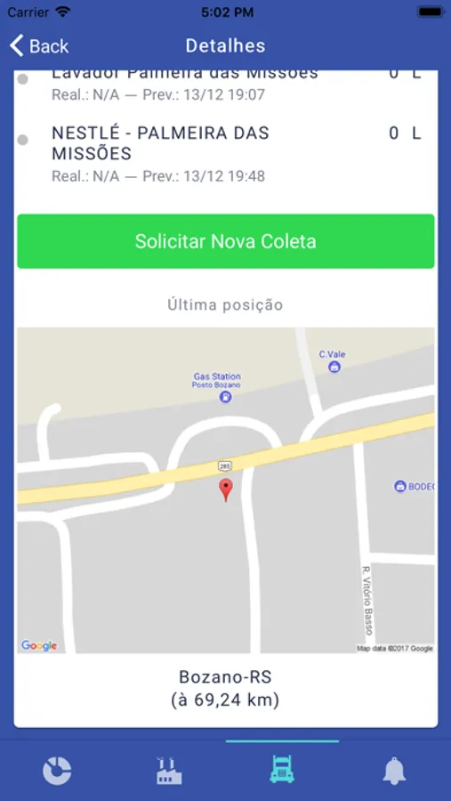 2. Visualizar os locais de parada/coleta e o horário de chegada real x previsto.