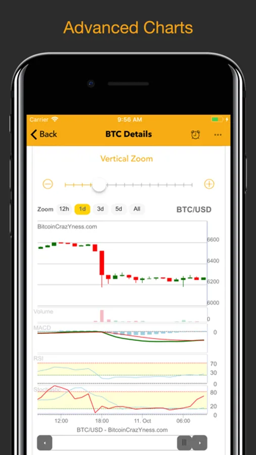 • Providing advanced interactive candlestick charts with indicators such as MACD, RSI, EMA, and SMA for mobile technical analysis on Bitcoin and Altcoins