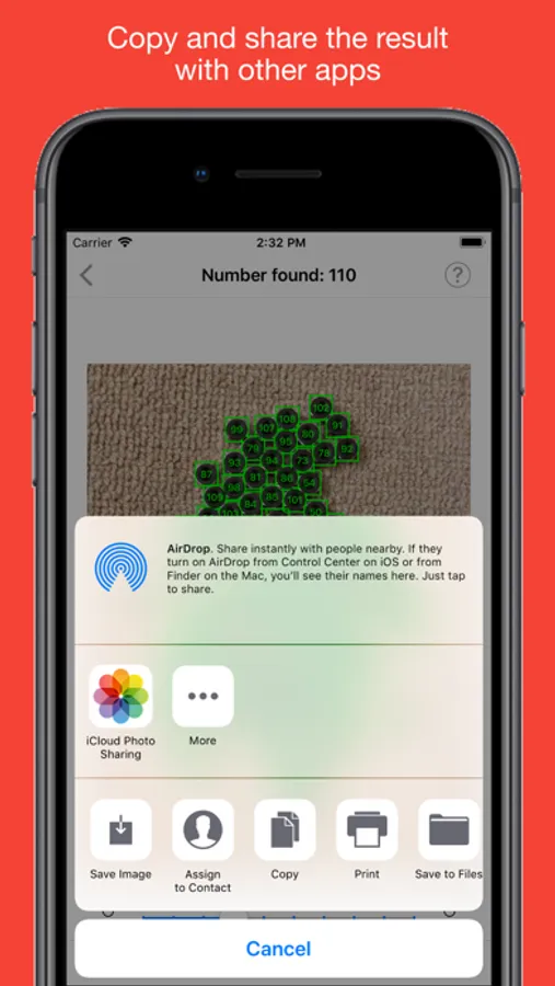After counting, the count result will be shown and all occurrences of the selected item will be marked in a new image. This image can be saved to your photo library, or copied and pasted into other apps. You can also directly share the result image with other apps (e.g. you can share the image with a messaging app, or a cloud service).