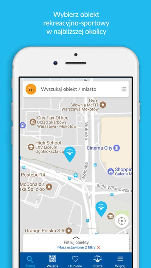 Aplikacja mobilna Medicover Sport pomoże Ci wyszukać dany obiekt, znajdujący się w Twojej okolicy. Wybierz interesującą Cię kategorię i korzystaj z szerokiej gamy usług sportowo – rekreacyjnych, dostępnych w pakietach Medicover Sport: siłownia, taniec, basen, tenis, sztuki walki, kręgle, bilard i wiele innych. My mamy to wszystko, a Ty masz możliwości. Postaw na aktywność fizyczną oraz rekreację i rozrywkę.