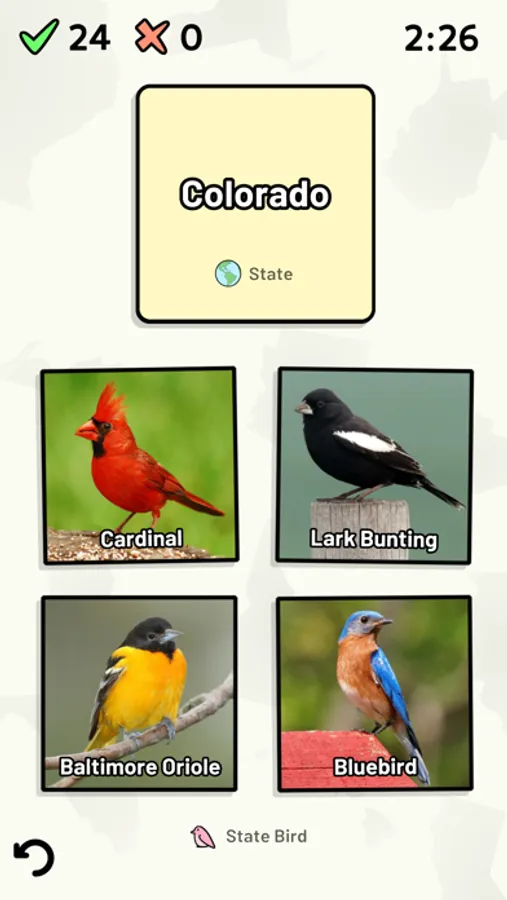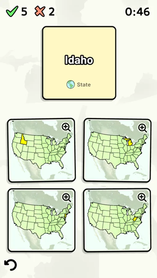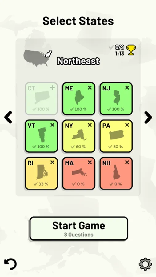 Customizable quizzes allow you to choose which states to test, as well as the topic. Past results for each state are displayed to highlight your progress at each topic.