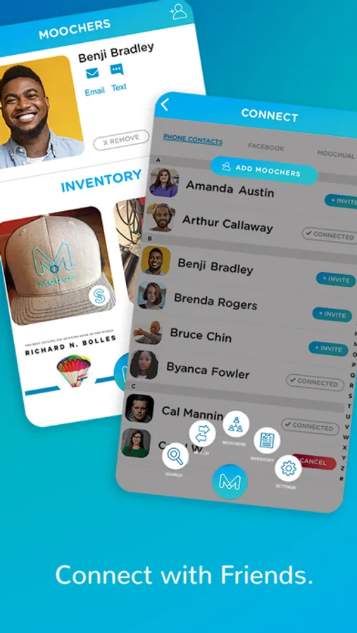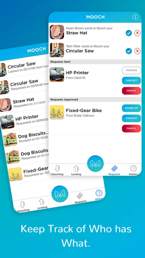 Mooch is a virtual inventory you create with your friends to share stuff you are willing to let each other borrow. Whether it's tools, clothes, books, baby stuff, or anything else, you simply take pictures of things you want to share or use the bar-code scanner to add items to your inventory. Then you simply click on "mooch it" when you want to borrow an item. Mooch will keep track of who borrows items, and also keeps a record when they are marked returned so you are less likely to lose stuff people borrow.