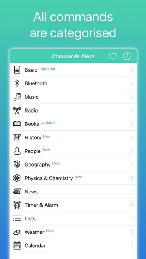This app provides a full list of commands for Amazon Echo with Alexa virtual assistant. All commands are categorised.