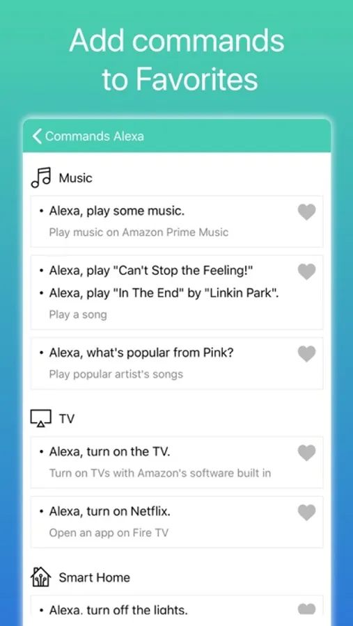 This app doesn't have an embedded voice assistant. You can use those commands to control Amazon Echo, Amazon Echo Dot, Amazon Echo Plus, Amazon Echo Show.
