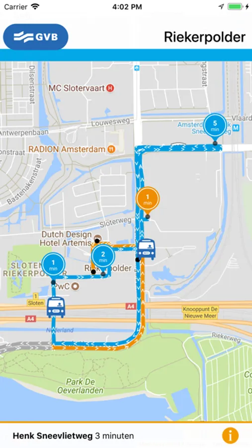 Use this app to follow the GVB buses around Riekerpolder. See live on the map how long it takes for the bus or shuttle to get to your stop.
