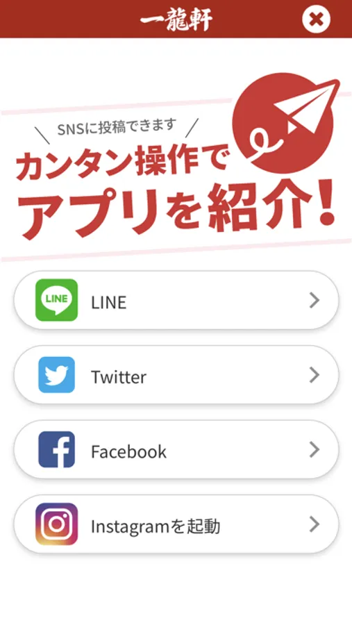 一龍軒のアプリをSNSを通じてお友達に紹介する事が可能です。