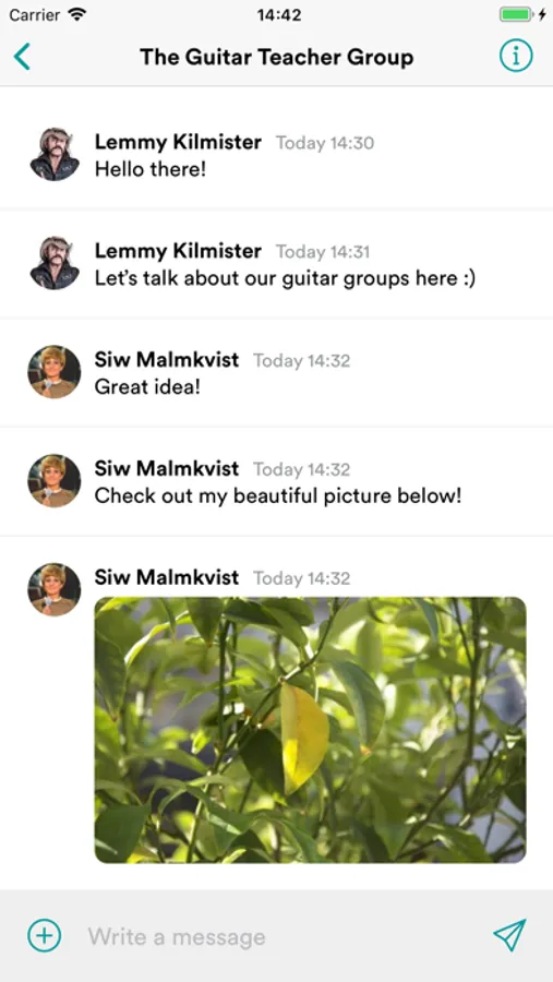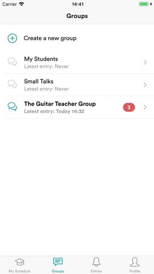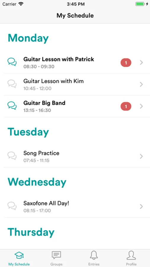 List of weekly lessons for students and teachers. Custodians see a list of all their children's active lessons. The list will be updated in real time if someone writes in one of the Groups.