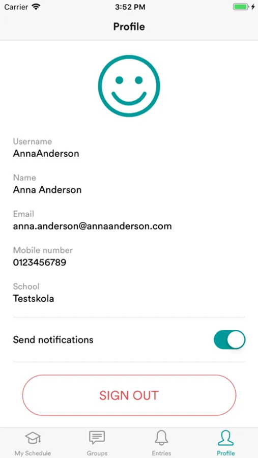 Lists info about the account that is logged in. You can also enable/disable notifications, and sign out. Profile image is displayed if it is selected on the web page.
