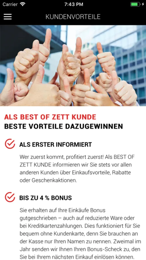 Ihre exklusiven Vorteile bekommen Sie direkt auf Ihr Smartphone gepusht. Damit können Sie direkt und sofort von Ihren Bonus-Schecks, Vorteilsgutscheinen wie €-Coupons, Give-aways und Rabatten profitieren und direkt mit der App bei uns einlösen.