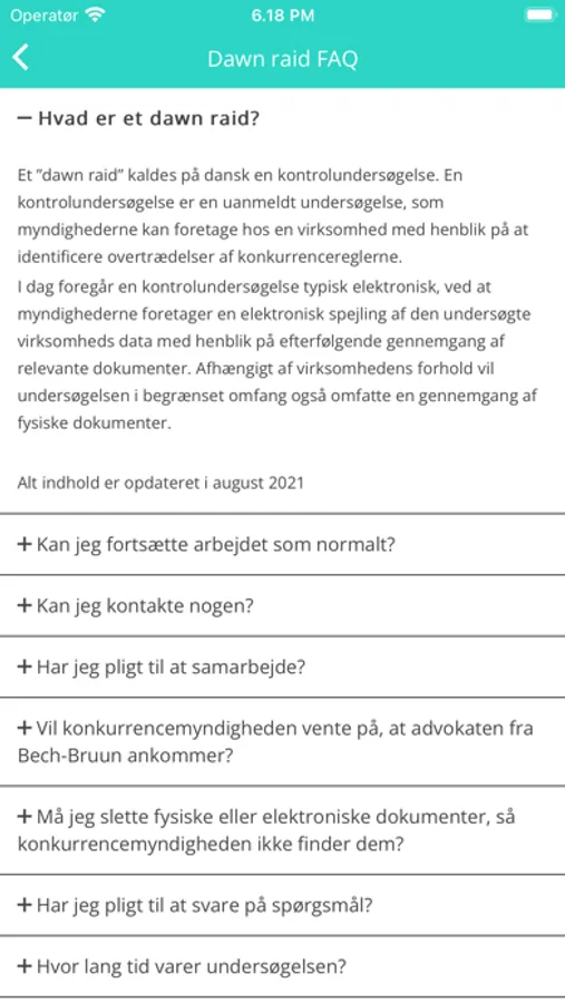 Bech-Bruuns dawn raid-app er et uundværligt element i en moderne virksomheds dawn raid-beredskab. Med app’en har I altid vejledning og de vigtigste råd lige ved hånden, ligesom app’en sikrer en genvej til Bech-Bruun, så I hurtigst muligt kan få adgang til den bedste rådgivning fra vores eksperter i tilfælde af et uanmeldt besøg fra konkurrencemyndighederne.