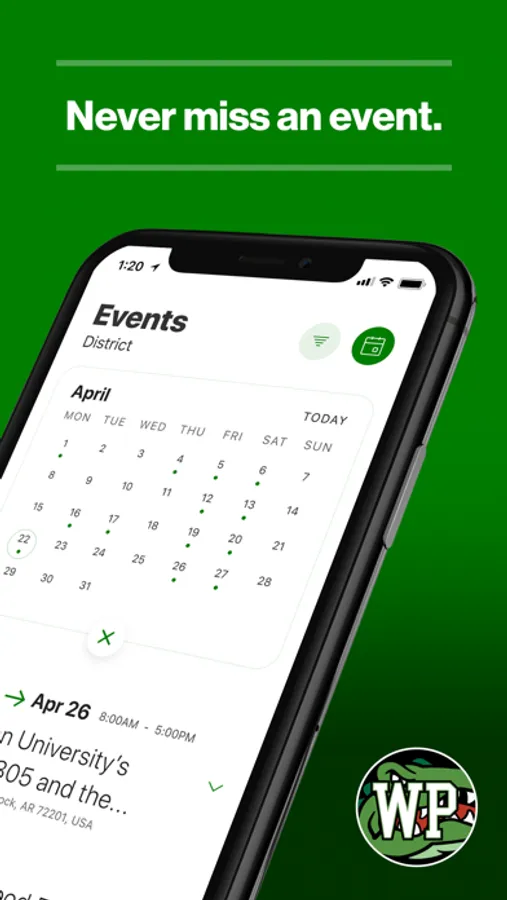 The event section shows a list of events throughout the district. Users can add an event to your calendar to share the event with friends and family with one tap.