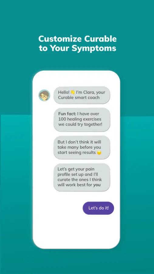 Get started on your Curable journey for free by chatting with our virtual coach, who will design a custom program tailored to your symptoms and preferences. During your journey, you’ll learn about the latest pain science through bite-sized audio lessons, then apply what you’ve learned using 100+ science-backed exercises for relief.