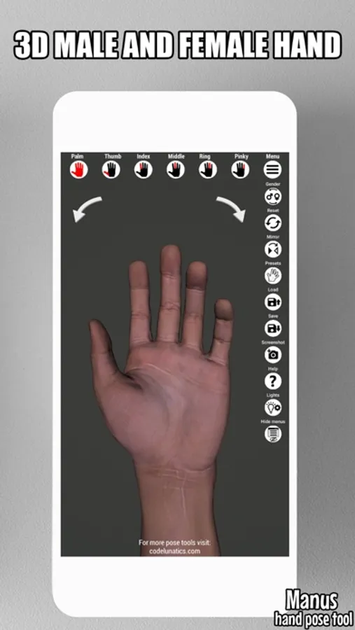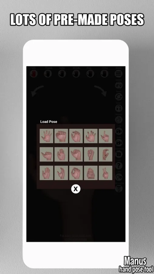With Manus app you can rotate, bend and set distance of every finger to get that pose you are looking for. With flexible camera controls you can pan and rotate hand model freely to examine pose from any angle.
