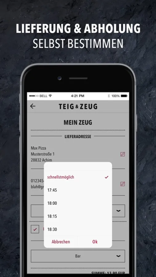 Mit der Teig&Zeug App kannst du dir per iPhone dein Lieblingsessen ordern – ganz bequem, von überall und jederzeit. Und so funktioniert’s: Postleitzahl eingeben, Store finden und schon kann es losgehen! Wir liefern aus einer großen Auswahl von Pizzen, Pasta, Baguettes, Burgern und Salaten direkt zu dir nach Hause. Dein Essen wird natürlich immer frisch zubereitet. Behalte auch unsere Aktionen im Auge - dort warten regelmäßig tolle Überraschungen auf dich.