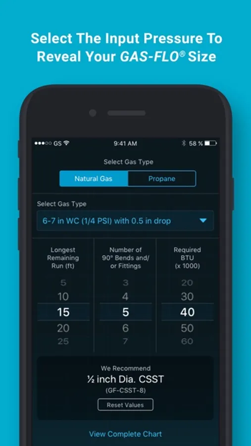 This App gives installers quick and accurate advice on sizing GAS-FLO® CSST tubing on the job. Simply follow the onscreen instructions, selecting the run length, inlet pressure and appliance BTU/hr requirements and the GAS-FLO® App will recommend the most appropriate Tubing size for each run.