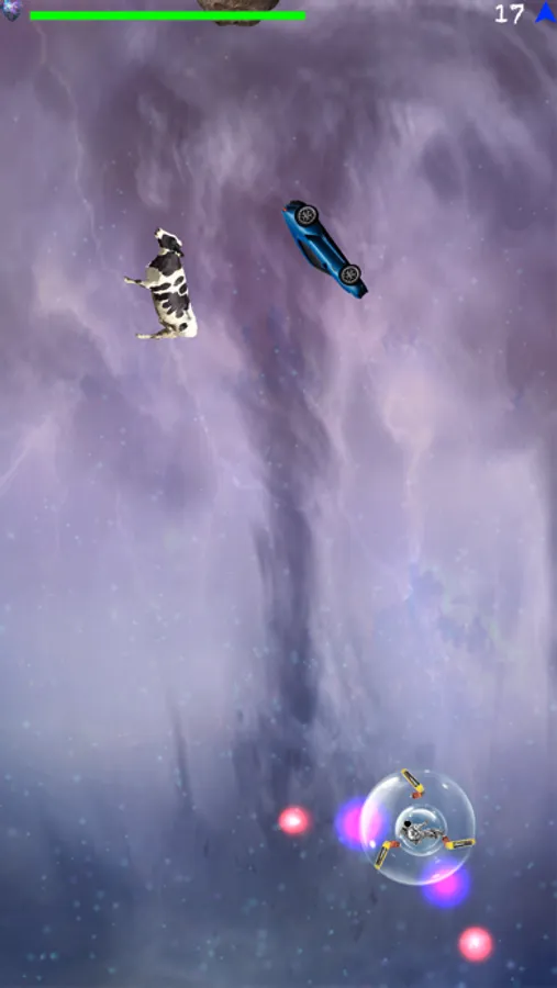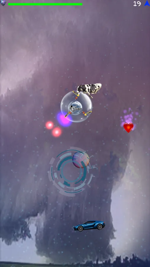 Try to escape crashing in poor cows and hard space objects by using your finger, the aircraft will follow it immediately. Your life is not endless, in case you are not that quick, try to charge your ship with an electric heart.