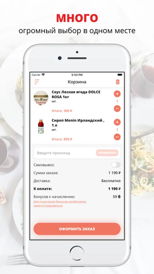 Бонусы и промокоды: мы начисляем 100 бонусов при регистрации, а также 200 бонусов в день рождения, которые в дальнейшем можно использовать для заказа еды в приложении.