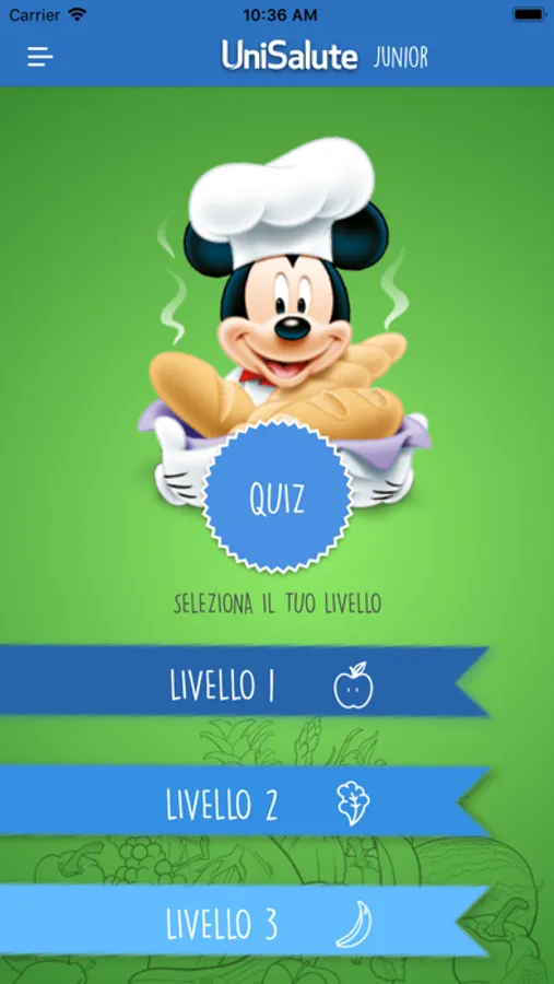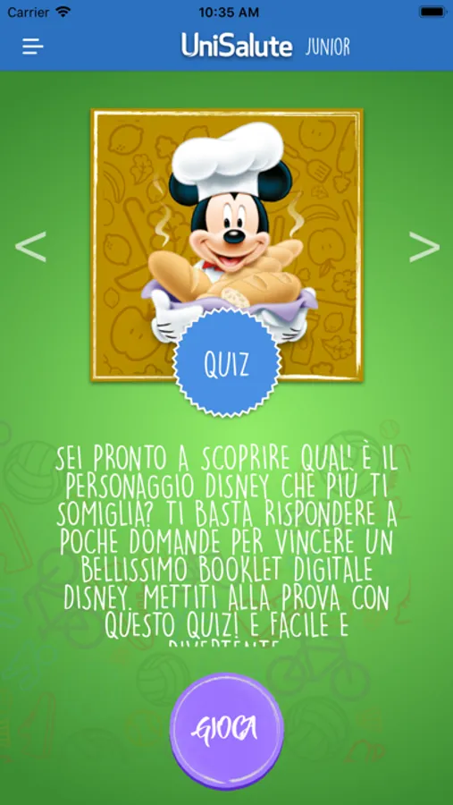 • Nella sezione Quiz trovi delle domande sullo stile di vita e l’alimentazione sana; le domande sono suddivise in tre livelli. Al termine di ciascun livello, hai diritto ad avere in premio, sbloccandole direttamente sul telefono o sul tablet, le prime pagine in formato Pdf del booklet Disney “Divertiamoci a Stare Bene”. Alla fine dei tre livelli, in base al numero delle risposte corrette, visualizzerai sul telefono o sul tablet il profilo corrispondente ad un personaggio Disney. Potrai sbloccare inoltre la terza ed ultima parte del booklet, in formato Pdf, così da completarlo.