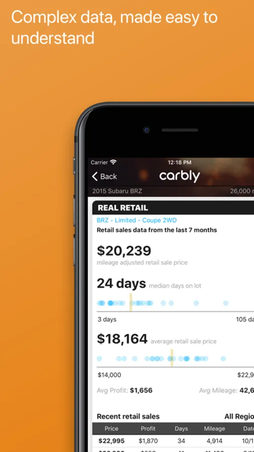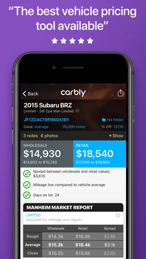 Just scan a VIN and Carbly shows you full wholesale and retail market data for the car or truck as well as local competitor inventory pricing.