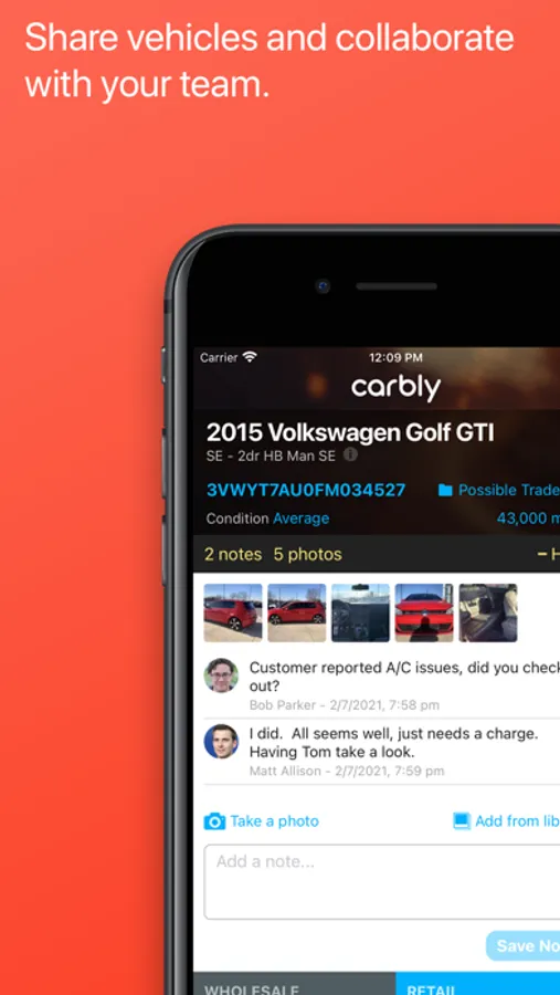 Carbly for Teams allows everyone on the same account to share vehicles, collaborate with notes and photos, and stay in the loop on dealership activity.