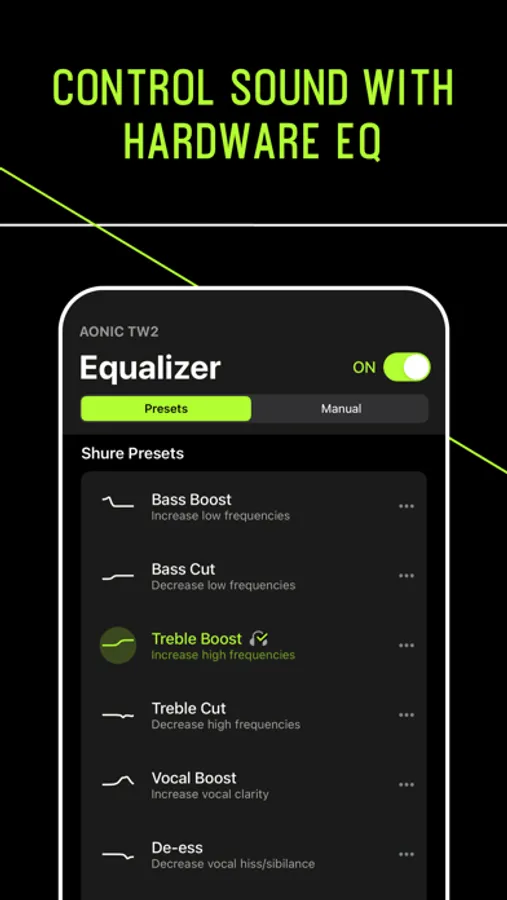 • Customizable EQ in the app or on your device — choose a preset or create your own