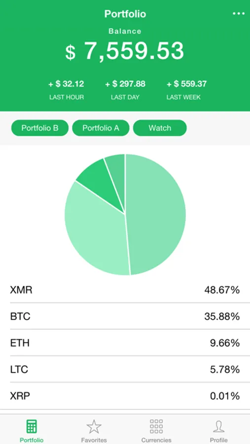- Allocations: Get a percent based view of each cryptocurrency in your portfolio.