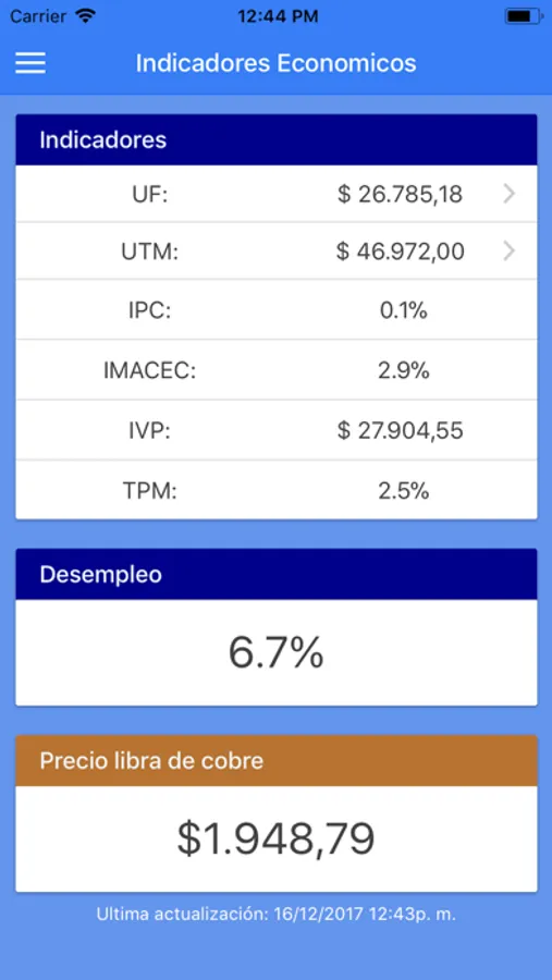 Esta aplicación incluye Dólar, Euro,UF,UTM,IPC,IMACEC, y el santoral del día anterior, actual y siguiente.