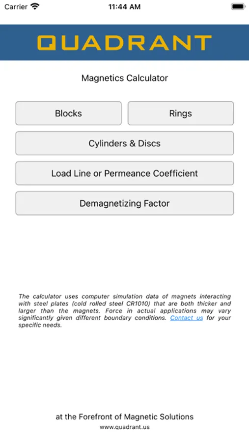 The calculator uses computer simulation data of magnets interacting with steel plates (cold rolled steel CR1010) that are both thicker and larger than the magnets. Force in actual applications may vary significantly given different boundary conditions. Contact us for your specific needs.