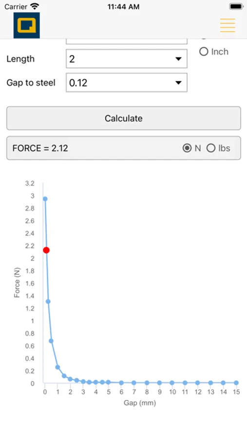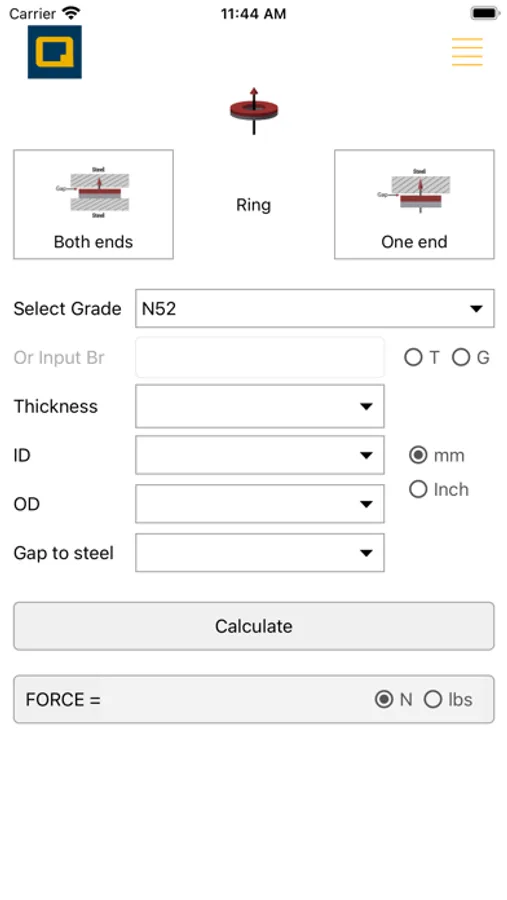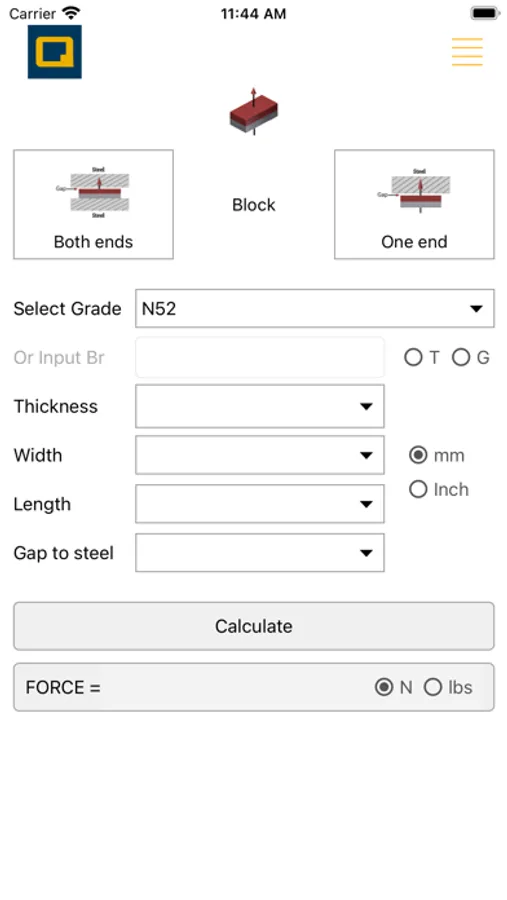 The users can get the results by selecting one of three magnet shapes, and one of two steel boundary conditions, as well as inputting the magnet dimensions and magnet grade or the Br value.