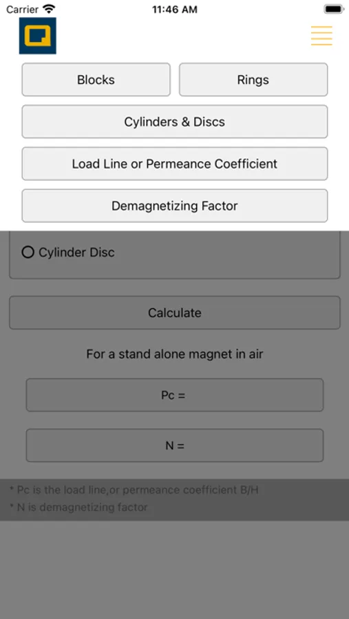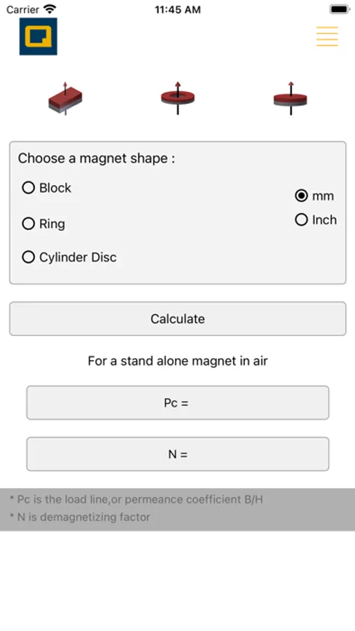 The Magnetics Calculator provides a mobile APP to conveniently calculate the magnetic force F, the permeance coefficient Pc, and the demagnetizing factor N for the following magnet shapes: