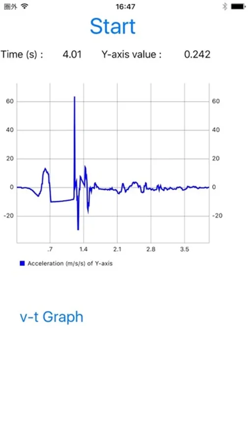 ・スマホの長手方向(Y軸方向)の加速度ー時間グラフを測定します。