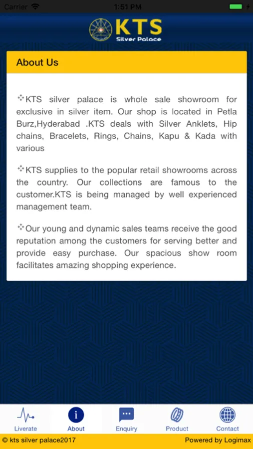 KTS silver palace is whole sale showroom for exclusive in silver item. Our shop is located in Petla Burz, Hyderabad .KTS deals with Silver Anklets, Hip chains, Bracelets, Rings, Chains, Kapu & Kada with various ranges of weights & size.KTS supplies to the popular retail showrooms across the country. Our collections are famous to the customer.KTS is being managed by well experienced management team.