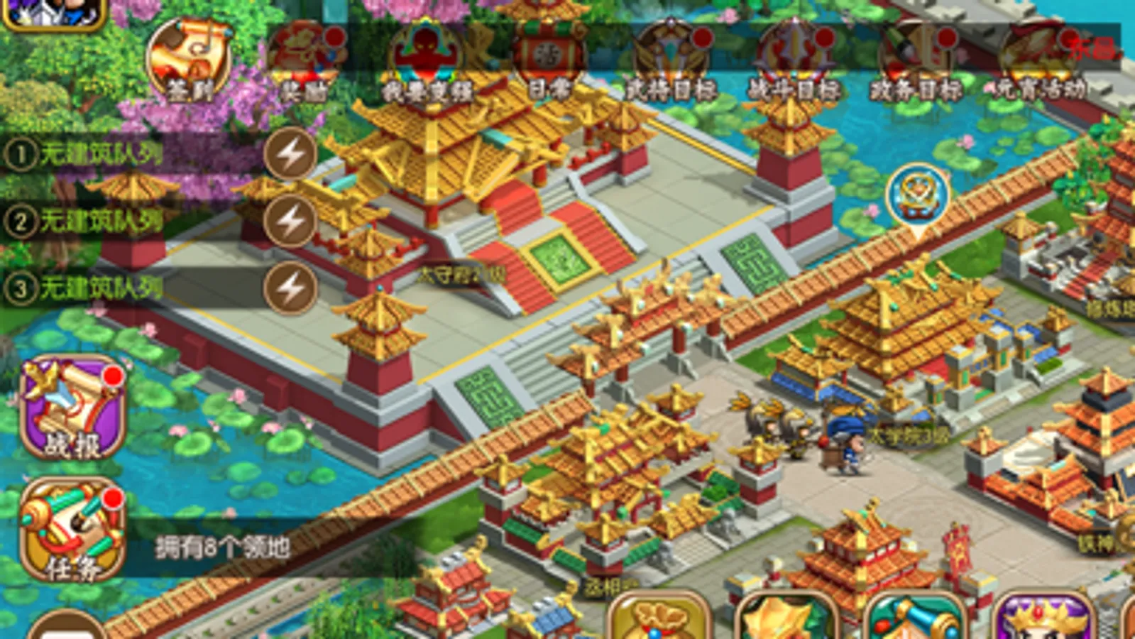 一开始你将在地图里拥有一座城池,所有玩家都能看到这个城池,你的城池分为城内和城外,你可以在城池里建设自己的建筑,比如生产建筑可以有农田哇、铁矿哇之类的;城市建筑有:城主府、兵营、鸿胪寺等等,每个建筑都有自己的功能和外观。玩家可以升级建筑来美化建筑外观。这种养成类的种田玩法,可以满足很多羊群玩家的需求。