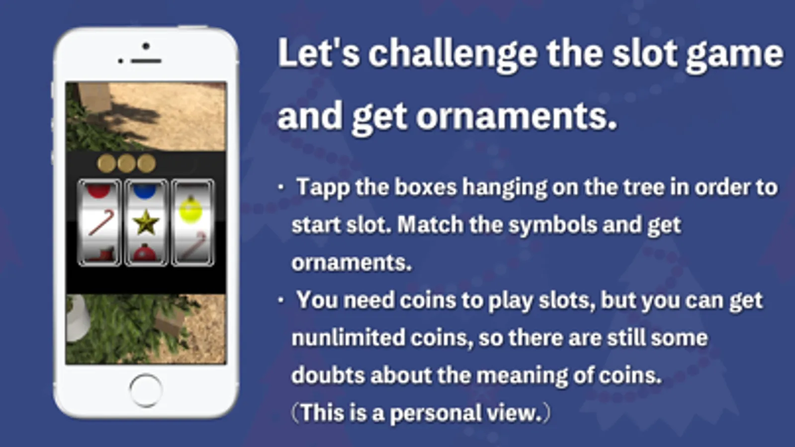 However, ornaments of the tree must be obtained with a slot machine. Let's challenge the slot by tapping the boxes which is hanging from the beginning. If you can match the symbols, you will get a nice ornament. But If you fail, your tree will be decorated with junk objects.