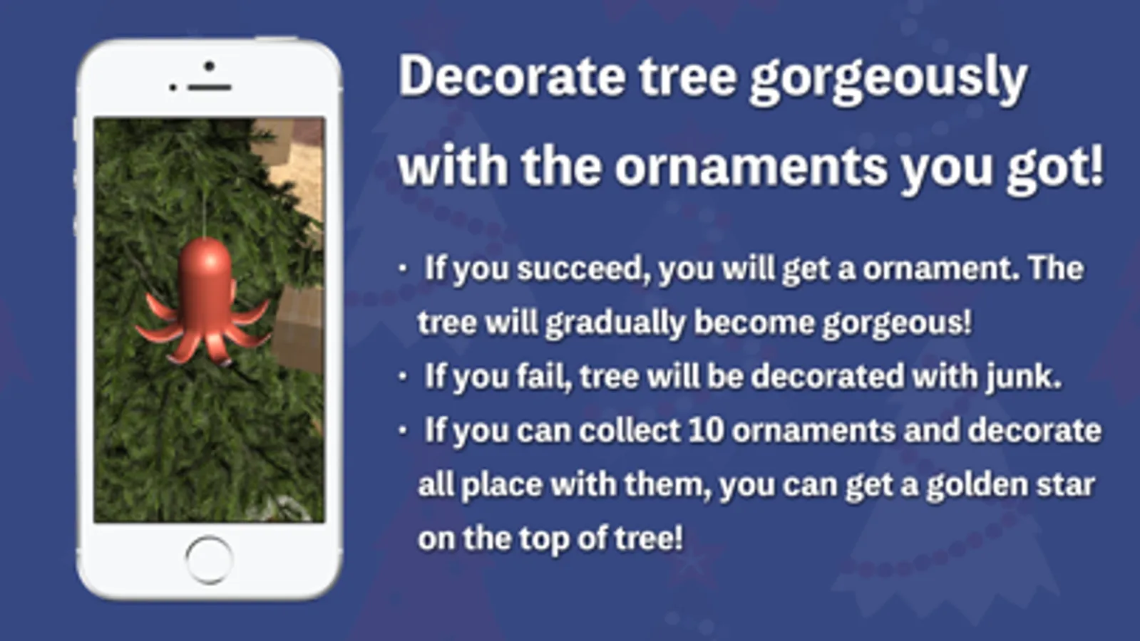 Ornaments can be decorated in 35 places in all. If you can decorate everything cleanly, you will be able to get a special ornament on the top of tree.