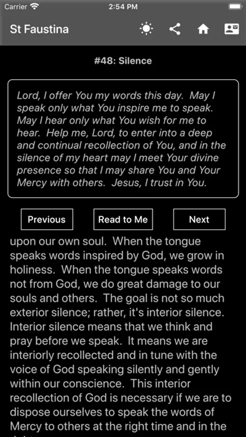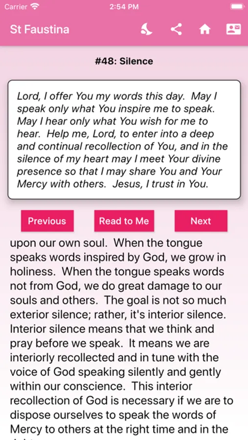 This app helps us stay close to God daily through the prayer and reflection. Each daily reflection starts with a prayer focused upon the message and reflection for that day. The reader is encouraged to pray this prayer several times. Ideally, it is prayed first thing in the morning, again during the day, and again at night.
