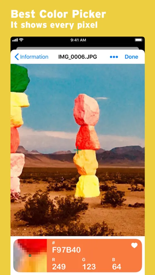 Color Picker+ helps you get color codes(RGB & HEX) and informations from any image, and it shows every pixel.