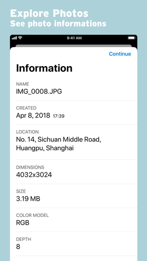 You can also view photo’s name, creation, location, dimension, size, color model, depth, profile name, software, focal length, lens all informations you need.