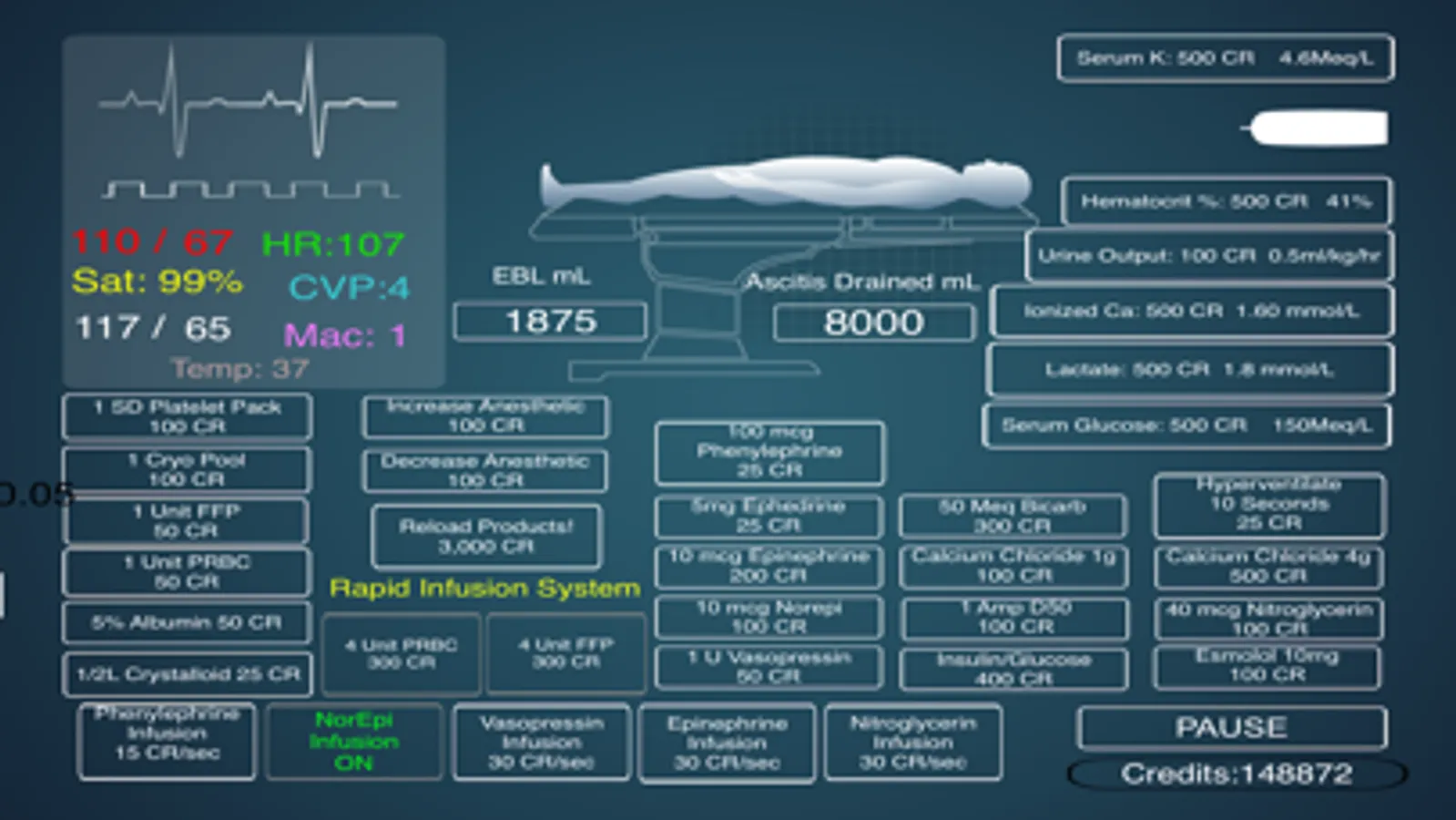 Welcome! This serious game is designed to teach you about the anesthetic management of an orthotopic liver transplant. It is designed for medical students, residents, and attendings. Please keep in mind that the case (which usually lasts several hours) is compressed into a very short time window. As such, all events and disturbances are accelerated. This game should in no way be considered medical advice, nor be considered to be a substitute for hands-on medical training. It does not fulfill any requirements and does not provide any CME credit.