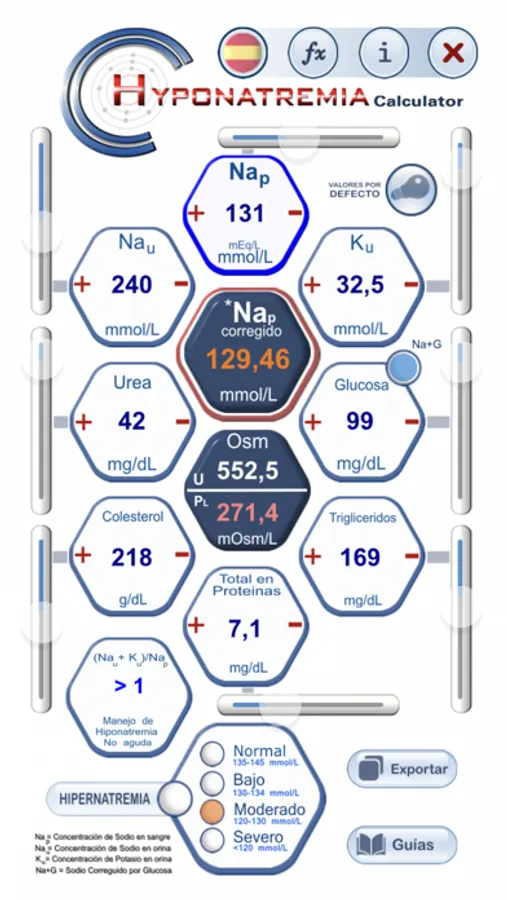 Hyponatremia Caculator permite el cálculo del nivel de sodio corregido en plasma, utilizando un conjunto de variables que pueden modificar la natremia.