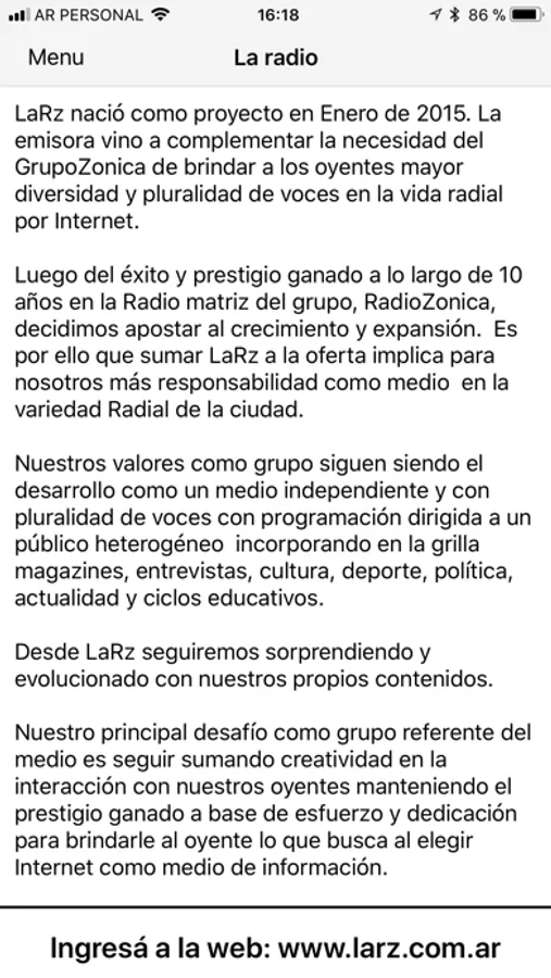 Luego del éxito y prestigio ganado a lo largo de 10 años en la Radio matriz del grupo, RadioZonica, decidimos apostar al crecimiento y expansión. Es por ello que sumar LaRz a la oferta implica para nosotros más responsabilidad como medio en la variedad Radial de la ciudad.