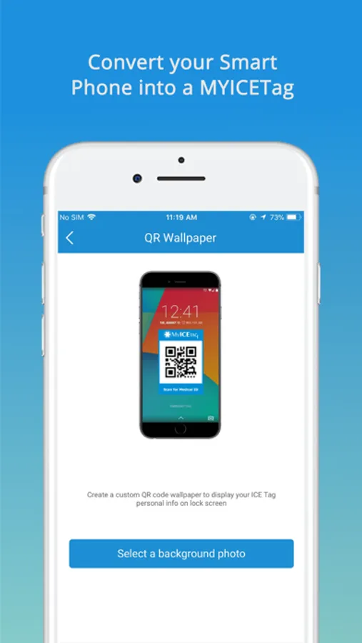 ## Turn your smart phone into a ICE Tag. The app embeds your emergency information into a custom QR code image for your phone's lock screen wallpaper. The QR code can be scanned by first responders to view your online profile.