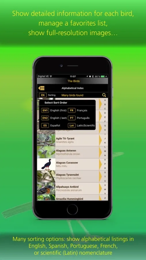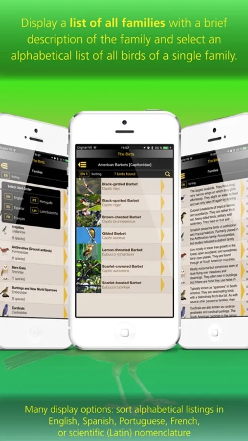 The app features a modern, intuitive graphical user interface with functions for searching the birds‘ names and in the full text, switching the sorting language for the listings and sort by English, French, Spanish, Portuguese, or the scientific (Latin) notation. In addition to the bird descriptions, the name of the birds in many languages can be displayed.