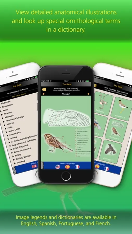 The current app version contains the descriptions and images of 1,700+ bird species found in Brazil. Moreover, an ornithological dictionary (English, French, Spanish, Portuguese) and detailed illustrations and drawings of bird anatomy are included.