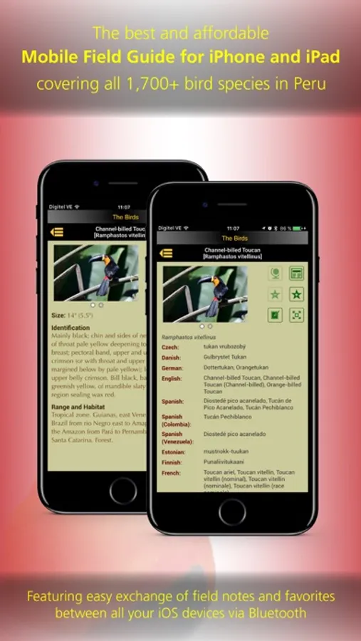 As with The Birds of South America, which contains more than 3,000 birds found on the entire continent, also The Birds of Peru runs on any iOS device and can exchange Field Notes and Favorites list between identical app versions on two or more devices via Bluetooth.
