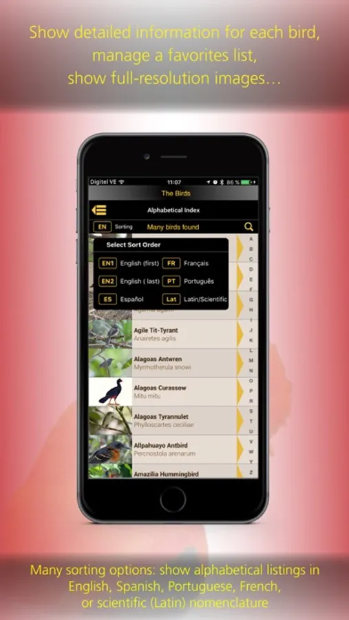 The app features a modern, intuitive graphical user interface with functions for searching the birds‘ names and in the full text, switching the sorting language for the listings and sort by English, French, Spanish, Portuguese, or the scientific (Latin) notation. In addition to the bird descriptions, the name of the birds in many languages can be displayed.