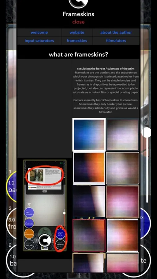 App includes by default 16 creative filters (Nerve, Dolce, Bewi, Sqare, Booty, Geoh, Ouibak, Moop, Dnaz, Semi, Morkmall, Habaen, Bomber Baba, Herate, Gulbul, Karbad Bob), 10 film-sensor simulations, and 12 border-framing filters.
